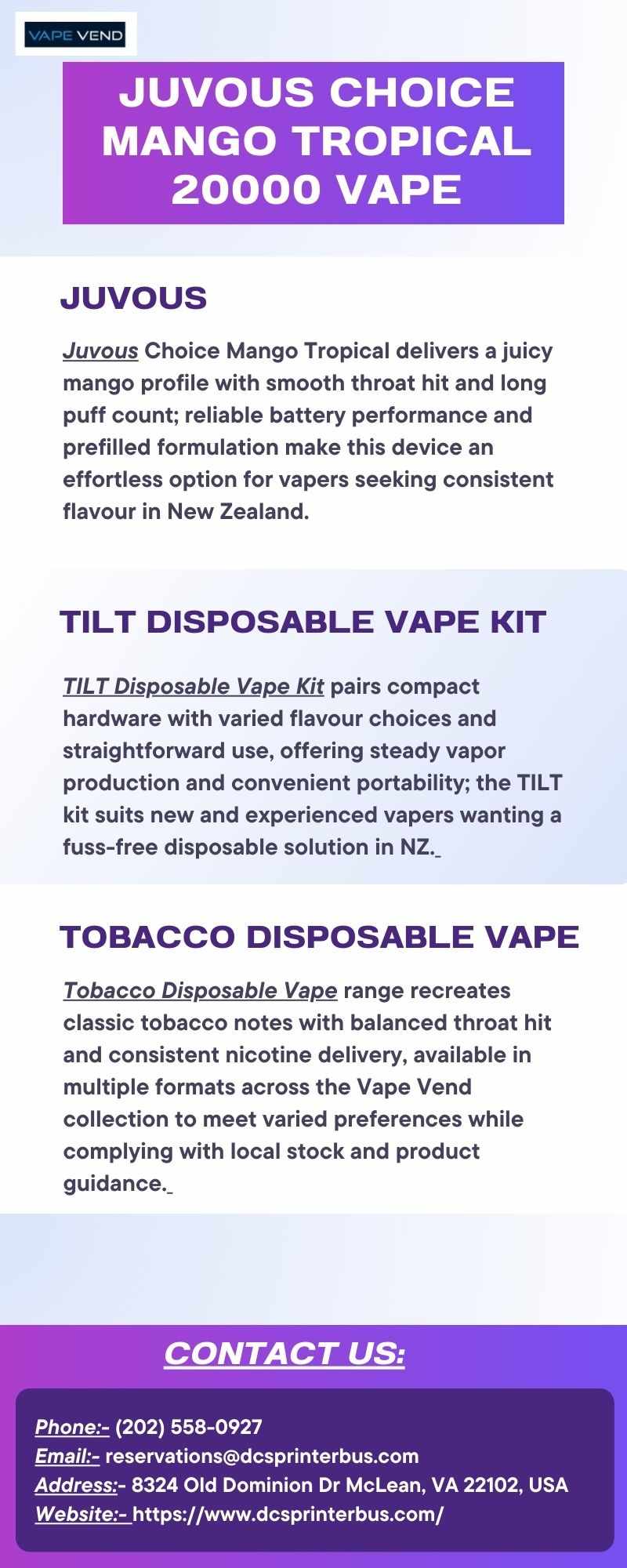 Juvous stands out with a mango-forward flavour profile, extended puff capacity and prefilled convenience; this Juvous Mango Tropical device emphasizes consistent inhale feel and simplified use for on-the-go vapers seeking dependable taste in NZ settings.